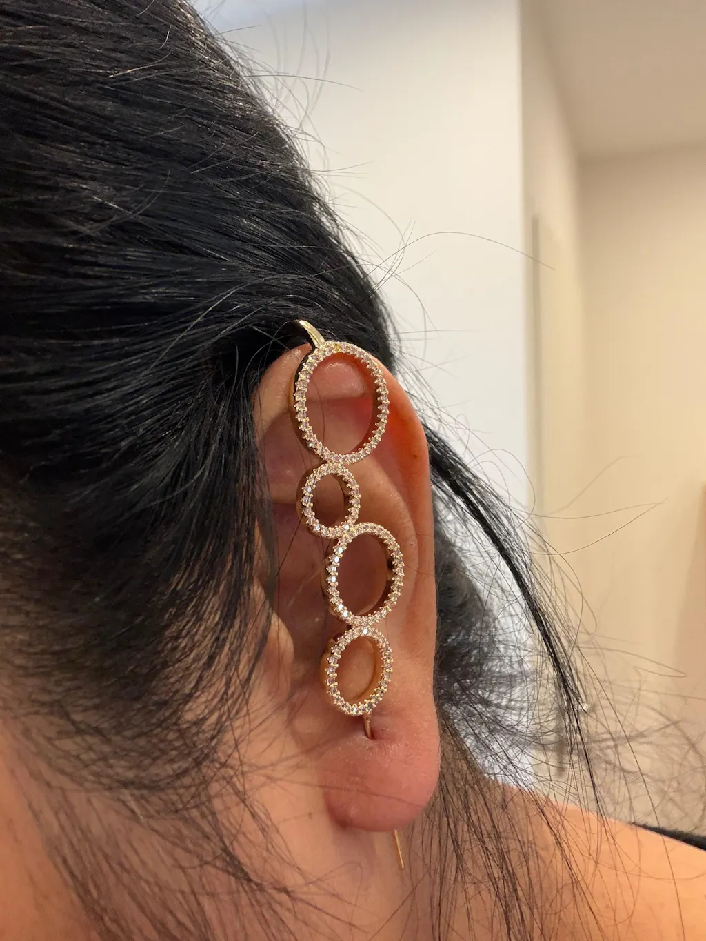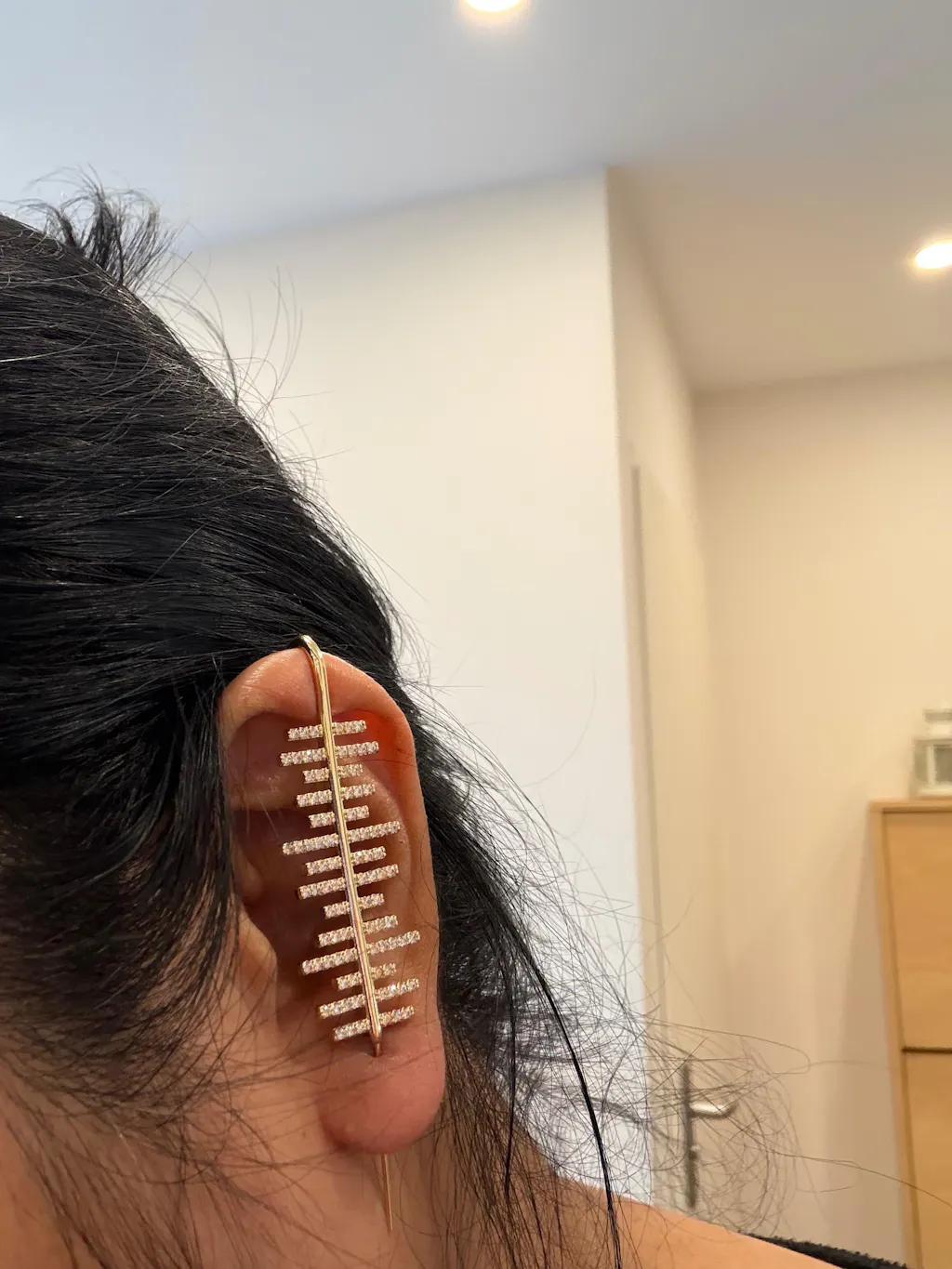Measure from the top of your ear (helix) to your lobe piercing. The total length of the earring is 5 cm (2 in), with a 2.3 cm (0.9 in) lower pin. The flexible helix hook allows for a secure, customized fit.